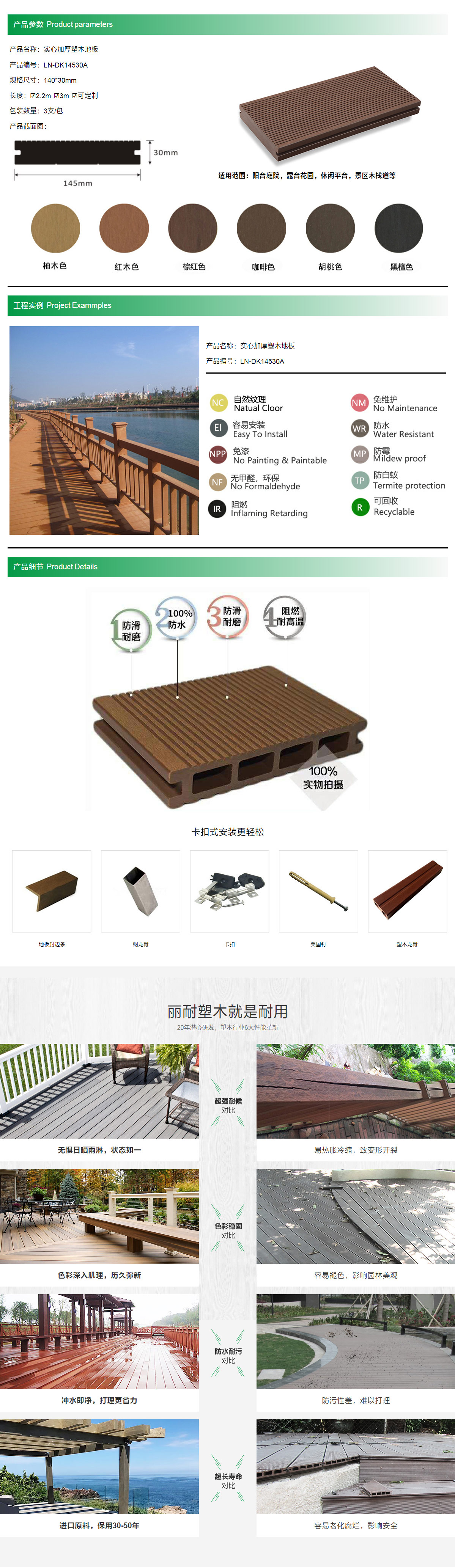 产品名称:圆孔塑木地板 产品编号:LN-DK14025F 规格尺寸:140*25mm 长度:☑2.2m ☑3m ☑可定制 包装数量:5支/包