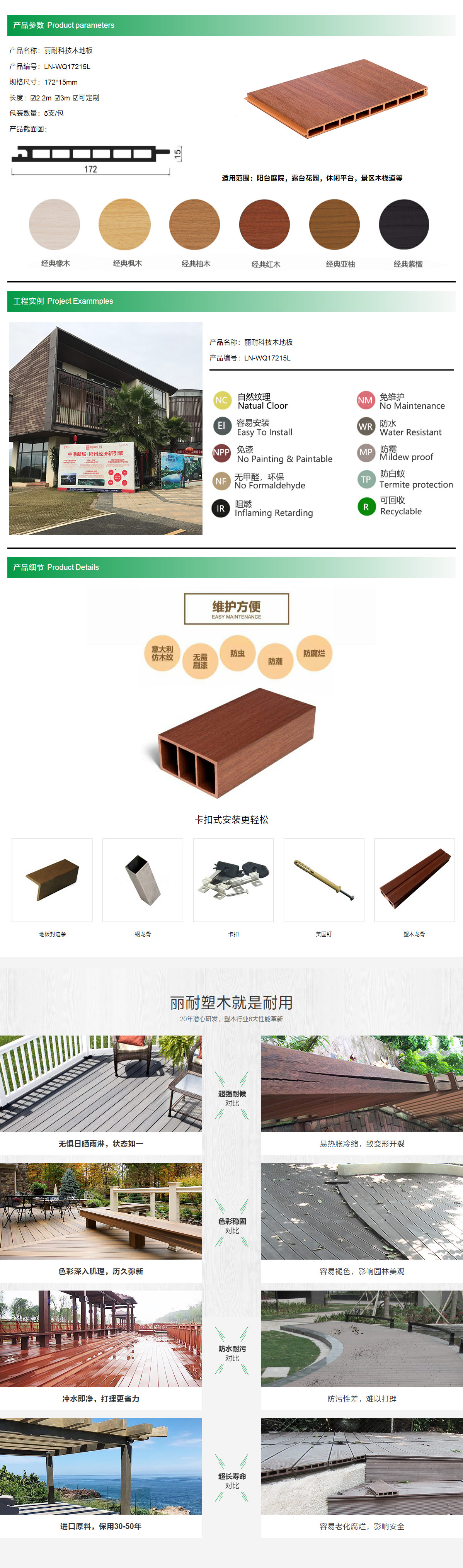 产品名称:丽耐科技木地板 产品编号:LN-WQ17215L 规格尺寸:172*15mm 长度:☑2.2m ☑3m ☑可定制 包装数量:5支/包