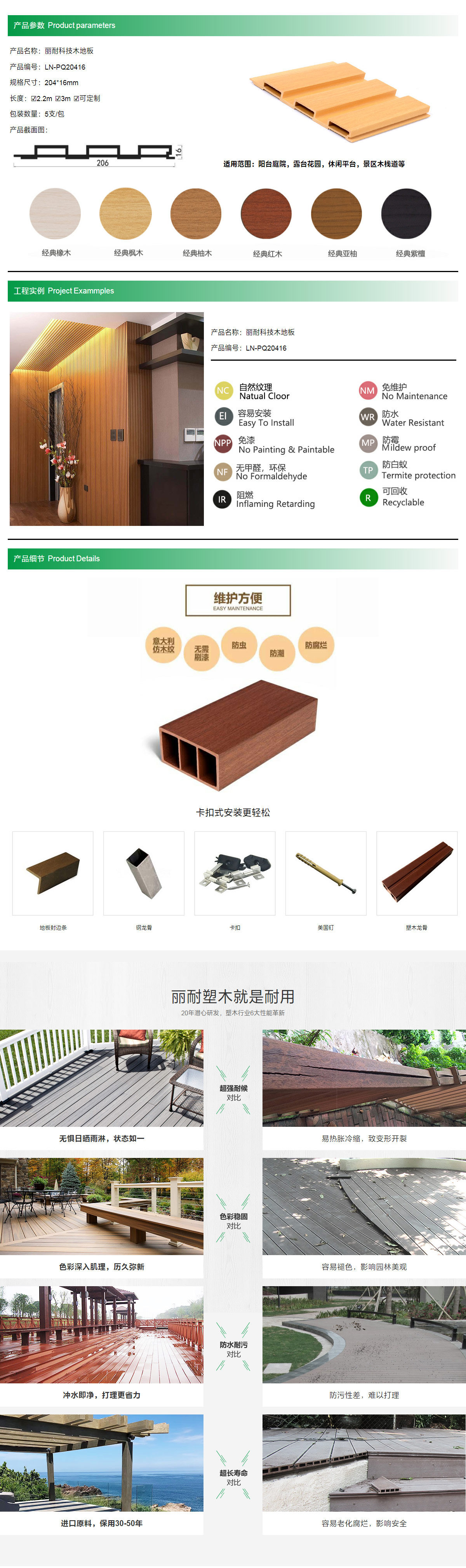 产品名称:丽耐科技木地板 产品编号:LN-PQ20416 规格尺寸:204*16mm 长度:☑2.2m ☑3m ☑可定制 包装数量:5支/包