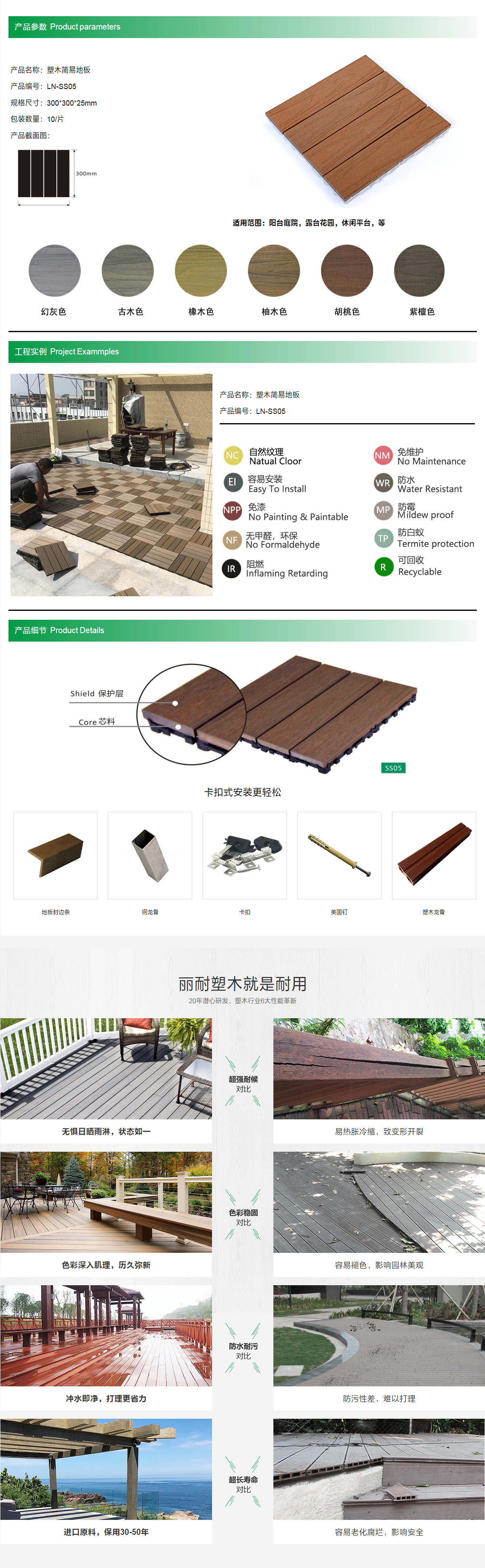 产品名称:塑木简易地板 产品编号:LN-SS05 规格尺寸:300*300*25mm 产品颜色:柚木色 包装数量:10/片